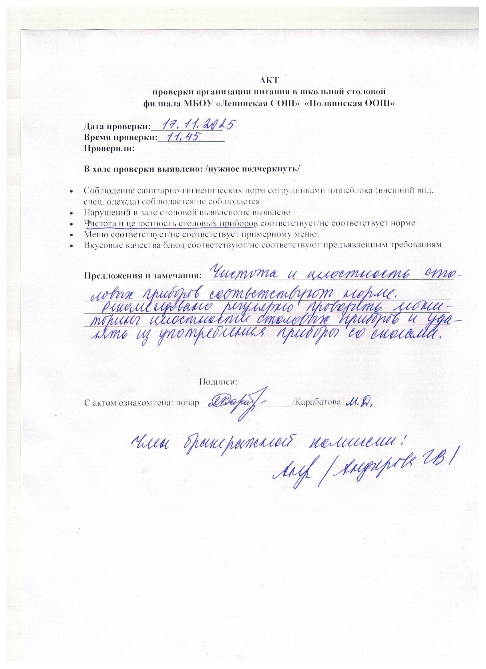 Акт по итогам проверки проведения общественного контроля питания (ноябрь)