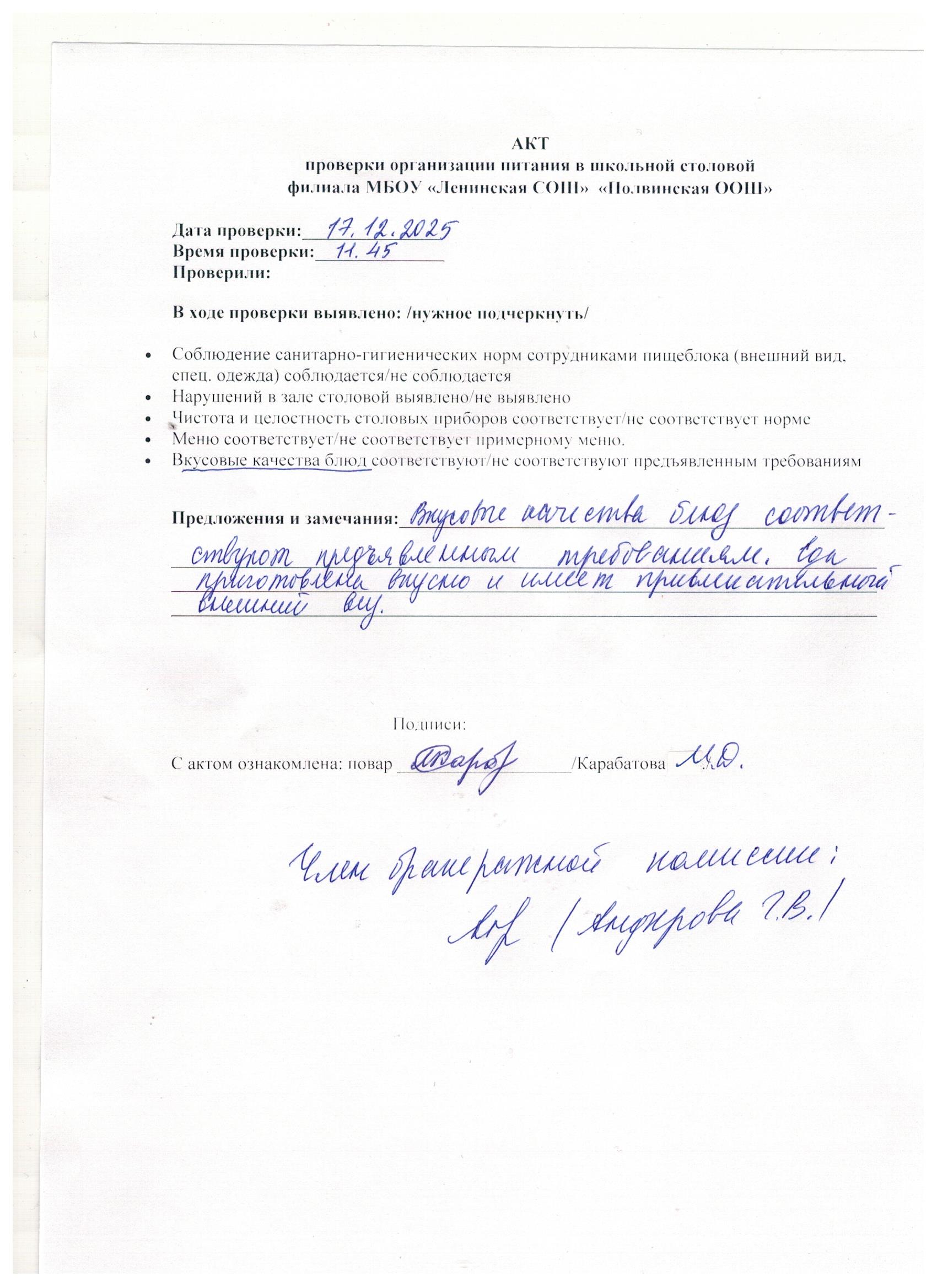 Акт по итогам проверки проведения общественного контроля питания (декабрь)