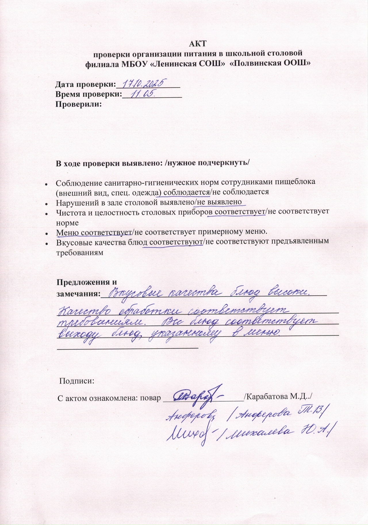 Акт по итогам проверки проведения общественного контроля питания (октябрь)