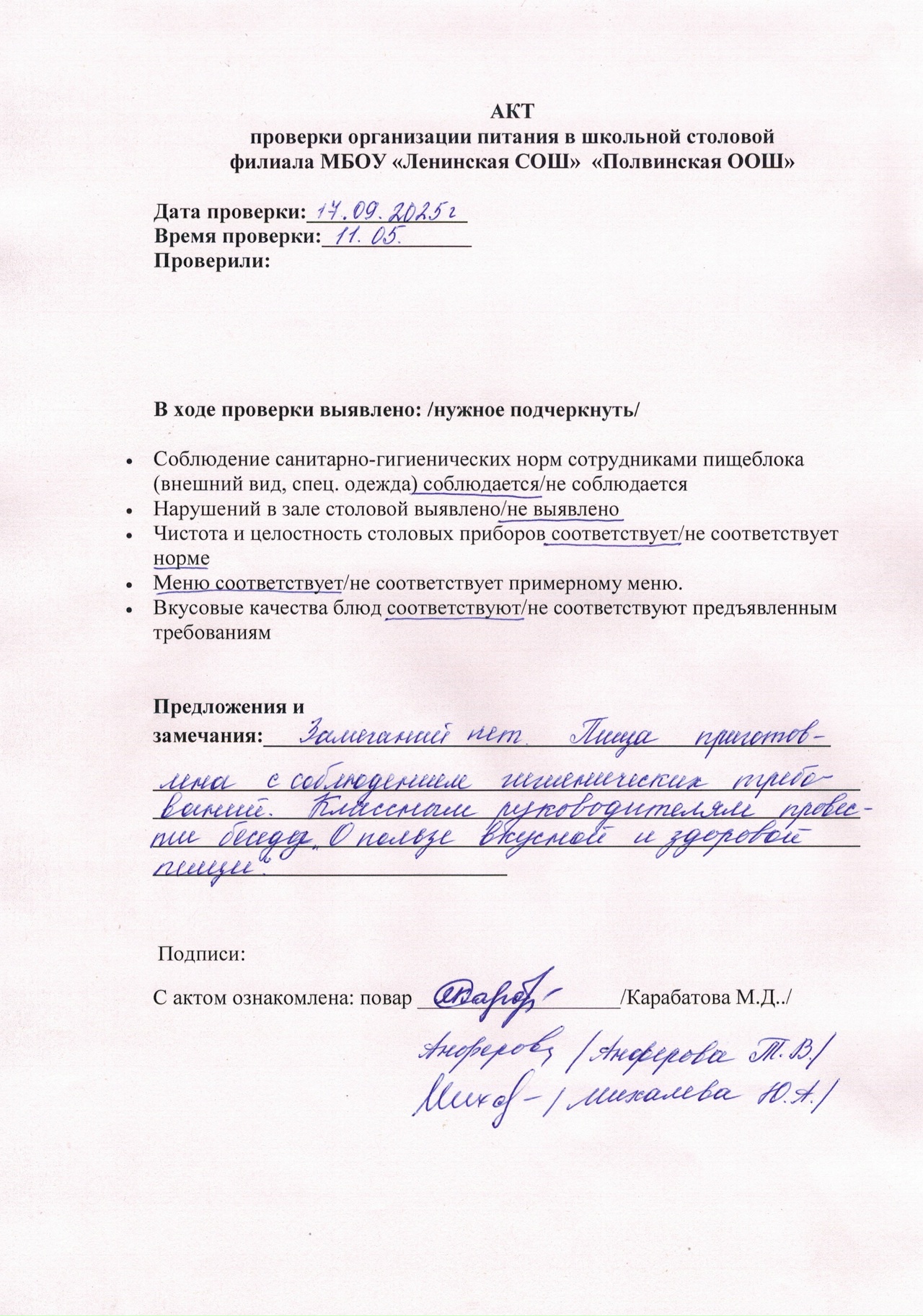 Акт по итогам проверки проведения общественного контроля питания (сентябрь)